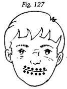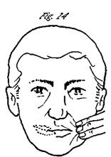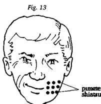 In cazul paraliziei muschiului orbicular al gurii, aplicati presiunea cu indexul, degetul mijlociu si inelarul asupra celor trei siruri alcatuite fiecare din cate trei puncte, care pornesc de la coltul gurii, intinzandu-se de-a lungul osului zi-gomatic (fig. 13). Repetati ori de cate ori apar simptomele. Apoi, cu cele trei degete, aplicati o presiune aspiratoare, pornind de la partea normala a gurii spre cea afectata; mentineti aceasta pozitie timp de zece secunde (fig. 14). Repetati ori de cate ori este nevoie.