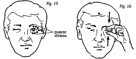 In cazul paraliziei muschiului orbicular al ochiului, aplicati tratamentul shiatsu cu indexul, degetul mijlociu si inelarul pe cele doua siruri alcatuite fiecare din cate trei puncte din fosele supraorbitale si suborbitale, si apoi pe cele doua puncte de la coltul exterior al ochiului (fig. 15). Repetati ori de cate ori este necesar.
