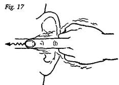 Pentru a opri imediat producerea sunetului in urechi, introduceti varful indexului in canalul auditiv si miscati-l inainte si inapoi, pentru a crea vibratii, care vor ajunge adanc in canal (fig. 17). Efectuati vibratia timp de zece secunde, apoi scoateti degetul din ureche. Actionati rapid. Repetati de trei ori.