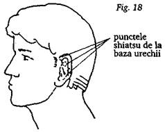 In continuare, aplicati tratamentul shiatsu cu indexul, degetul mijlociu si inelarul asupra celor trei puncte din regiunea temporala, in spatele urechii, si mergand pana la baza ei (fig. 18). Aceste puncte sunt situate pe muschiul auricular anterior, pe muschiul auricular superior si pe cel auricular posterior.
