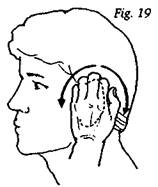 Apoi, cuprindeti urechea cu toate degetele. Apasati puternic cu partea car-piana a mainii partea din fata a urechii, ce este complet acoperita de mana (fig. 19). Usor, dar rapid, rasuciti urechea spre interior si spre exterior, pentru fiecare directie de zece ori. In sfarsit, tinand mana in aceeasi pozitie, dar exercitand o presiune mai puternica, pentru a inchide complet urechea, produceti vibratii timp de zece secunde. Dupa aceea, degajati rapid urechea. Repetati de trei ori.