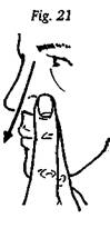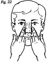 grija, fiecare presiune durand trei secunde. Repetati cinci pana la zece ori. Stretching. Lucrand cu ambele maini, puneti peste index degetul mijlociu, asezandu-le apoi langa nara stanga si cea dreapta. Trageti in jos, simultan, dinspre coltul ochiului, continuand sa apasati (figurile 21 si 22). Mentineti aceasta pozitie timp de cinci secunde. Repetati de trei ori.