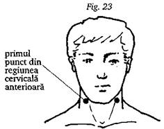 Shiatsu. Majoritatea persoanelor care sufera de insomnie se plang de rigiditatea regiunii cervicale (in special a celei anterioare), a regiunii su-prascapulare, interscapulare, a spatelui in general si a regiunii abdomenului (in special a diafragmei). Tratamentul shiatsu incepe cu primul punct din regiunea cervicala anterioara stanga (fig. 23). Presiunea asupra acestui punct nu trebuie sa fie puternica, si nici nu e indicat sa dureze mult. In timpul tratamentului, gatul trebuie sa aiba o pozitie naturala, cu muschii relaxati. Fiecare apasare efectuata cu degetul mare trebuie sa fie lenta, viguroasa si sa dureze trei secunde.
