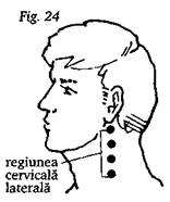 Apoi, cu indexul, degetul mijlociu si inelarul ambelor maini, apasati simultan cele patru puncte cervicale laterale (fig. 24). Fiecare presiune trebuie sa dureze trei secunde. Repetati de trei ori.