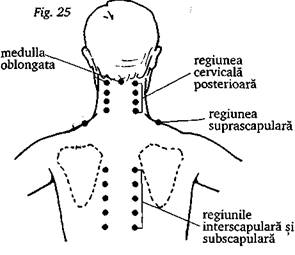 Apasati cele doua puncte suprascapulare, apoi cele doua siruri alcatuite din cate cinci puncte ce se intind de la zona interscapulara la cea subscapulara (fig. 25). Incepeti cu punctul stang suprascapular. Apasati cu indexul, degetul mijlociu si inelarul mainii drepte. Fiecare presiune trebuie sa dureze cinci secunde. Repetati de trei ori.