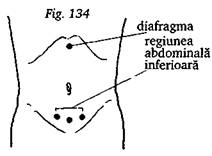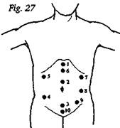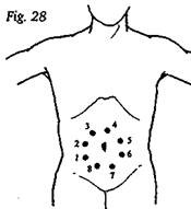 Tratamentul shiatsu pentru zona abdominala se efectueaza in pozitia culcat cu fata in sus. Pornind din regiunea diafragmei, aplicati presiunea cu palma asupra celor zece puncte raspandite pe abdomen (fig. 27). Fiecare apasare trebuie sa dureze trei secunde. Repetati de trei ori. Apoi, apasati cu palma cele opt puncte din jurul ombilicului (fig. 28). Fiecare presiune va dura trei secunde; repetati de trei ori. Apoi, asezand mainile suprapuse peste ombilic, provocati vibratii timp de zece secunde. Repetati de trei ori.