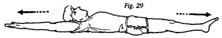 Stretching. In final, din pozitia culcat pe spate, tinand picioarele drepte si bratele deasupra capului, intindeti partea superioara a corpului in sus, iar cea inferioara in jos, cat mai puternic posibil (fig. 29). Mentineti aceasta pozitie timp de zece secunde. Repetati de trei ori.
