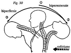 Avand drept cauza principala traficul infernal din marile aglomerari urbane, sindromul "loviturii de bici' apare in general in urma accidentelor de automobil. Partea superioara a persoanei care sufera coliziunea este brusc aruncata in fata. Dar, in acelasi timp, propria sa greutate impinge brutal capul spre spate, astfel incat gatul suporta mai intai o hiperextensie, iar apoi o hiperflexie (fig. 30). Atunci cand impactul este puternic, capul poate sa fie aruncat inainte si inapoi de mai multe ori, aidoma capatului unui bici.