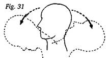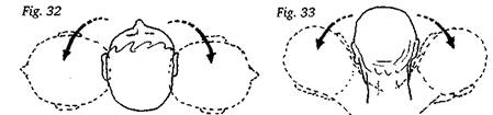 Shiatsu. Mai intai, examinati starea muschilor, miscand capul inainte si inapoi, pentru a extinde si flexa regiunea cervicala (fig. 31). In acelasi timp, rotiti incet gatul spre dreapta si spre stanga, apoi aplecati-l la dreapta si la stanga, pentru a vedea daca se misca usor (fig. 32 si 33).