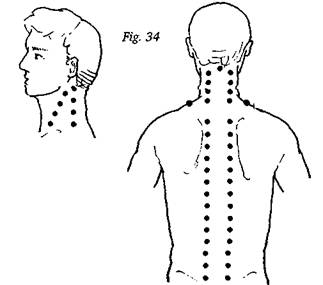 Dupa aceea, palpati cu grija regiunea cervicala anterioara, zona medulla oblongata, regiunea cervicala posterioara, regiunea suprascapulara, zona dintre regiunea interscapula-ra si cea subscapulara, precum si regiunea lombara, efectuand tratamentul shiatsu pe toate punctele unde starea muschilor o cere (fig.34).