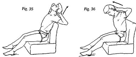 Stretching. Asezati-va pe un scaun sau pe o canapea cu spatarul jos si relaxati-va corpul. Impreunati-va degetele ambelor maini si puneti palmele pe ceafa. Apoi, intindeti gatul dand capul pe spate intr-un unghi de 30 (fig. 35). Mentineti aceasta pozitie timp de zece secunde, dupa care reveniti in pozitia initiala. Repetati de trei ori. Apoi, aplecati capul in fata, de asemenea la 30, pentru a efectua flexia (fig. 36). Mentineti aceasta pozitie zece secunde; repetati de trei ori.