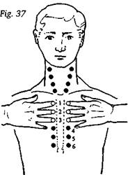 Pe piept, pe muschii intercostali, de ambele parti ale sternului, se gasesc doua siruri de puncte shiatsu (fig. 37). Pornind de sus, apasati simultan punctele din stanga si pe cele din dreapta cu indexul, degetul mijlociu si inelarul ambelor maini. Fiecare presiune trebuie sa dureze trei secunde. Repetati de trei ori.