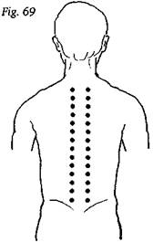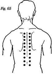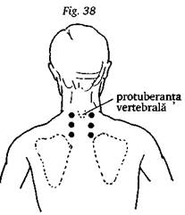 Dintr-o parte si din cealalta a protuberantei vertebrale (cea de-a saptea vertebra cervicala), care poate fi palpata atunci cand capul este aplecat in fata, porneste cate un sir alcatuit din trei puncte de tratament shiatsu (fig. 38). Sirurile se intind pana in imediata vecinatate a regiunii interscapulare.