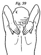 Duceti mainile la spate si cu indexul, degetul mijlociu si inelarul ambelor maini apasati simultan sirul stang si pe cel drept (fig. 39). Fiecare presiune trebuie sa dureze trei secunde. Repetati de trei ori.