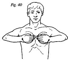 Stretching. Puneti palmele strans lipite de piept, in asa fel incat varfurile aratatoarelor, ale degetelor mijlocii si ale inelarelor sa se atinga pe stern. Apoi, apasand, executati zece rotatii spre exterior; repetati de zece ori (fig. 40).
