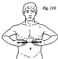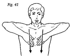 In final, indreptand degetele in jos si mentinand palmele lipite de piept, frecati diafragma repede si cu forta, in timp ce expirati (fig. 41).