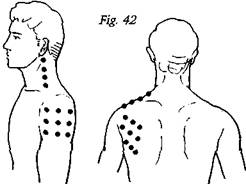 Shiatsu. Dupa aplicarea viguroasa a presiunii shiatsu in zona celor patru puncte din regiunea cervicala laterala, pentru a face muschii mai flexibili, incepeti un tratament in zona articulatiei umarului (fig. 42). Opriti-va asupra sirurilor anterior, mediu si posterior, alcatuite din cate trei puncte, de pe muschiul deltoid, asupra celor patru puncte ce pornesc de la regiunea suprascapu-lara si ajung pana la articulatia umarului, precum si asupra celor trei siruri alcatuite din cate trei puncte care coboara in diagonala pe partea exterioara a scapulei. Presiunea se exercita cu indexul, degetul mijlociu si inelarul.