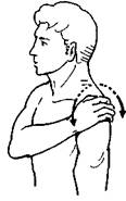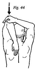 Stretching. Apucati un umar cu palma mainii de pe partea opusa si rotiti articulatia de cinci ori inainte si de cinci ori inapoi (fig. 43). Repetati exercitiul, de trei ori, alternand miscarea indreptata inainte cu cea indreptata inapoi. Apoi, ridicati bratul, indoiti cotul si duceti mana la spate. Puneti cealalta mana pe cotul indoit si impingeti in jos (fig. 44). Mentineti aceasta pozitie timp de zece secunde.