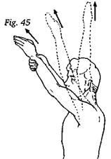 In continuare, ridicati bratele, pe diagonala. Apucati incheietura mainii supuse tratamentului cu cealalta mana (fig. 45). Apoi, in trei etape, ridicati bratul pana deasupra capului. Mentineti aceasta pozitie timp de zece secunde. Repetati de trei ori. Atentie, nu indoiti cotul bratului tratat!