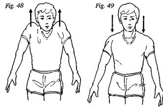 Stretching. In prima faza, stati in picioare in pozitie relaxata cu mainile lasate in jos. Apoi, ridicati ambii umeri, cat mai mult posibil (fig. 48). Mentineti aceasta pozitie timp de zece secunde, dupa care, brusc, relaxati umerii si reveniti in pozitia initiala (fig. 49). Repetati de trei ori.