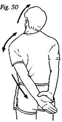 In continuare, duceti ambele maini la spate si apucati cu mana dreapta articulatia celei stangi. Aplecand capul spre dreapta, trageti mana stanga in jos cu mana dreapta (fig. 50). Mentineti aceasta pozitie timp de zece secunde; repetati de trei ori. Pentru umarul drept, procedati in acelasi fel.