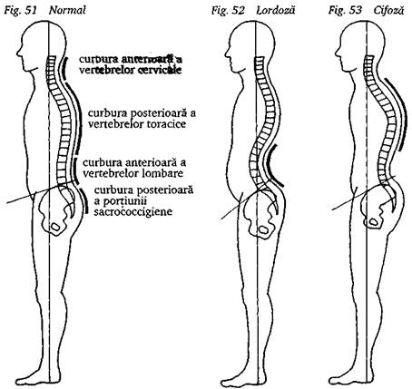 Vazuta din fata, coloana vertebrala normala este perfect dreapta. Vazuta dintr-o parte, ea este alcatuita din patru curburi fiziologice. Cele sapte vertebre cervicale formeaza o linie usor curba indreptata spre fata (curbura anterioara) . Cele douasprezece vertebre toracice formeaza o linie curba indreptata spre spate (curbura posterioara). Sirul vertebrelor lombare se curbeaza spre fata (curbura anterioara), iar vertebrele sacrale si coccisul se curbeaza usor spre spate (curbura posterioara) (fig. 51). Intreaga coloana este ca un S dublu. Daca oricare dintre aceste curburi este mai mare sau mai mica decat ar fi normal, rezulta una dintre starile patologice pe care le vom descrie mai jos.