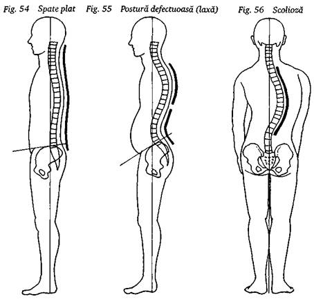 Spate plat. In cazul acesta, curburile portiunilor cervicale, toracice si lombare sunt anormal de mici, astfel incat, vazuta dintr-o parte, coloana pare aproape dreapta (fig. 54). Aceasta limiteaza flexia partii superioare a corpului, provoaca rigiditatea muschilor, a ligamentelor, modifica echilibrul centrului de greutate al corpului si genereaza dureri de spate si in regiunea lombara.