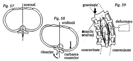 malformatia progreseaza, apare o iesire in afara a coastelor, care nu exista niciodata in stare normala. Rigiditatea constanta a muschilor dintr-o parte sau alte a coloanei poate provoca acest tip de curbare anormala. Excesul de greutate care apasa doar pe o singura parte a vertebrelor genereaza o deformare care mareste tendinta de scolioza (fig. 59).