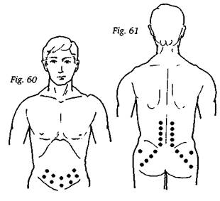 Lordoza. Efectuati un tratament shiatsu profund, atent, asupra punctelor Namikoshi si asupra punctelor de pe partea inferioara a abdomenului, de pe regiunea lombara si de pe regiunea fesiera (figurile 60 si 61).