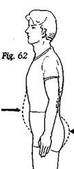 Pentru stretching, mai intai adoptati o pozitie comoda in picioare. Contractati simultan partea de jos a abdomenului, tragandu-l spre spate, si fesele, impingandu-le inainte (fig. 62). Mentineti aceasta pozitie timp de zece secunde; repetati de trei ori.
