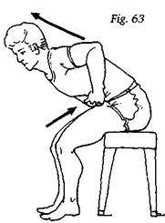 In continuare, executati o intindere in sus, pe diagonala, stand pe un scaun, impreunand degetele ambelor maini in fata dumneavoastra, iar apoi plasati-le pe partea inferioara a abdomenului. In timp ce faceti aceasta, aplecati-va trunchiul oblic inainte (fig. 63). Ramaneti asa zece secunde, apoi reveniti intr-o pozitie asezat comoda. Repetati de trei ori. Acest exercitiu reduce curbura anterioara lombara prin intinderea muschilor spatelui.