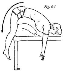 Pentru exercitiul final de stretching, asezati doua-trei perne pe marginea unei mese sau a unui birou. Culcati-va cu fata in jos peste ele, asezand abdomenul pe partea mai inalta a pernelor. Astfel, picioarele se ridica de pe podea. Relaxati-va, lasand ambele picioare sa atarne (fig. 64). Intindeti regiunea lombara in acest fel timp de douazeci de secunde. Apoi coborati picioarele. Repetati de trei ori.