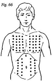 Fiecare apasare dureaza cinci secunde. Repetati intre trei si cinci ori. Apoi, apasati cele sase siruri alcatuite din cate patru puncte, din regiunea intercostala a pieptului. Fiecare presiune va dura trei secunde. Repetati de trei ori.