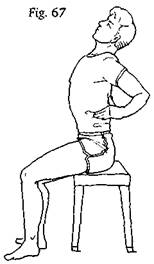 Tratamentul shiatsu pentru spate este deosebit de important; el ar trebui sa se efectueze zilnic, din pozitia in picioare, in genunchi sau asezat. Procedura ce urmeaza este foarte eficienta. Stand pe scaun, duceti mainile inapoi si plasati ambele degete mari pe spate, cat mai sus posibil. Apasati simultan cu ambele degete si aplecati trunchiul spre spate (fig. 67).