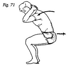 Pentru stretching, stati in picioare, impreunati degetele ambelor maini si puneti-le pe ceafa. Apoi, indoiti genunchii, aplecati partea superioara a corpului inainte si trageti inapoi fesele (fig. 71). Mentineti aceasta pozitie timp de zece secunde. Reveniti in pozitia initiala dupa fiecare executie; repetati de zece ori