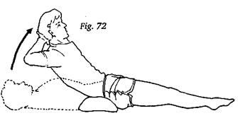 In continuare, asezand o perna sub regiunea lombara, culcati-va pe podea cu fata in sus. Impreunati degetele ambelor maini si puneti palmele pe ceafa. Apoi, ridicati partea superioara a corpului (fig. 72). Repetati de zece ori.