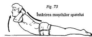 Pozitie defectuoasa (laxa). Dupa ce ati efectuat tratamentul de shiatsu si stretching prescrise pentru lordoza si cifoza, mariti efectul terapiei intinzand cu putere muschii spatelui si ai abdomenului. Mai intai, intariti spatele cu ajutorul exercitiului urmator. Culcati-va pe podea cu fata in jos, impreunati degetele ambelor maini si puneti-le pe ceafa, apoi ridicati trunchiul (fig. 73). Ramaneti asa zece secunde, apoi reveniti in pozitia initiala si relaxati-va. Repetati de trei ori. In continuare, intariti muschii abdominali. Culcati-va pe podea cu fata in sus, pune-