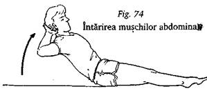ti-va mainile pe ceafa si ridicati trunchiul (fig. 74). Ramaneti asa zece secunde, apoi reveniti in pozitia initiala. Repetati de trei ori.
