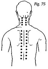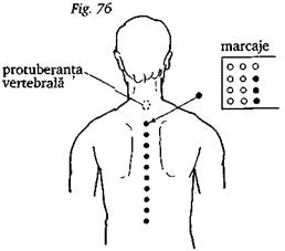 Scolioza. Tratamentul shiatsu se efectueaza pe ambele parti ale coloanei vertebrale, acordandu-se o atentie speciala celor patru puncte din regiunea cervicala posterioara si celor zece puncte din zonele inter- si subscapulare (fig. 75). Verificati gradul de curbare prin localizarea atenta a apofizelor (proeminentelor) fiecarei vertebre toracale mai jos de protuberanta vertebrala (apofiza celei de-a saptea vertebre cervicale) si marcand-o pe fiecare in parte intr-un fel oarecare (fig. 76).