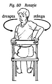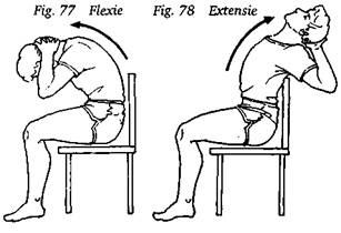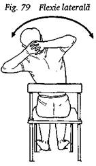 Pentru stretching, asezati-va pe un scaun, impreunand degetele ambelor maini si punand apoi palmele pe ceafa; din aceasta pozitie, aplecati-va in fata, in spate, apoi la stanga si la dreapta (fig. 77-79). In continuare, apucati spatarul scaunului cu ambele maini si rasuciti trunchiul la dreapta si la stanga (fig. 80). Fiecare exercitiu trebuie sa dureze zece secunde. Repetati de trei ori.