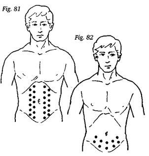 Shiatsu. Mai intai, din pozitia culcat cu fata in sus, efectuati tratamentul shiatsu asupra muschilor drepti abdominali. Punctele de aplicare a presiunii sunt situate pe doua siruri, de ambele parti ale ombilicului: sapte pe sirul interior si sase pe cel exterior (fig. 81). Impreunand degetele ambelor maini, aplicati presiunea asupra fiecarui punct, simultan pe stanga si pe dreapta, cu regiunile carpiene ale palmelor. Porniti de sus in jos. Tratati intai sirurile interioare, apoi pe cele exterioare. Repetati ori de cate ori este necesar. Apoi, tratati aceleasi puncte, simultan, cu indexul, degetul mijlociu si inelarul ambelor maini.