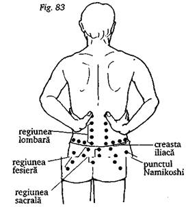 puncte in regiunea lombara, trei pe creasta iliaca, punctul Namikoshi, patru puncte pe fese si trei in regiunea sacrala (fig. 83). Cu degetele mari, apasati aceste puncte, simultan pe dreapta si pe stanga; in felul acesta, intreaga regiune lombara si regiunea fesiera vor deveni flexibile.