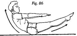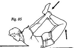 Dupa aceea, culcati-va cu fata in jos, tinand picioarele intinse. Apucati fiecare glezna cu mana corespunzatoare (fig. 85). Tragand de glezne, ridicati concomitent picioarele si trunchiul cat se poate de sus. Mentineti aceasta pozitie timp de zece secunde. Apoi, asezati-va pe podea, cu picioarele intinse. Intindeti si ambele maini
