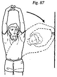 Stand in picioare, cu partea stanga a corpului spre perete, la o distanta de aproximativ cincisprezece centimetri de acesta, impreunati degetele, intoarceti palmele in sus si ridicati bratele deasupra capului (fig. 87). Trageti trunchiul si bratele in sus si aplecati-va spre perete, pana cand palmele se lipesc de acesta. Mentineti aceasta pozitie timp de zece secunde. Repetati de trei ori. Apoi, intoarceti-va si efectuati acelasi exercitiu pe partea dreapta.