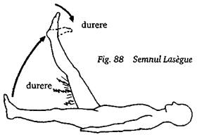 Nervul sciatic, care porneste din regiunea lombara si se intinde de-a lungul membrelor inferioare, este cel mai gros si cel mai lung nerv periferic din corpul omenesc. Intrucat se afla aproape de suprafata pielii, el poate fi afectat cu usurinta. Sciatica, una dintre cele mai frecvente suferinte legate de acest nerv, poate fi provocata de frig, de umiditate, de unele deformari ale vertebrelor lombare sau de pozitia defectuoasa a organelor interne. Semnul Las gue este utilizat adesea pentru diagnosticare. Stand culcat pe podea, cu picioarele intinse, pacientul ridica un picior - daca durerea apare in partea posterioara a coapsei atunci cand piciorul este la un unghi de 45 fata de podea, inseamna ca individul respectiv sufera de sciatica. Dorsiflexia labei piciorului va provoca o durere si mai mare (fig. 88).