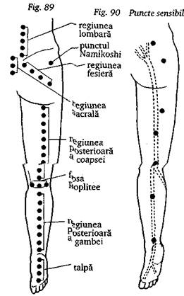 Shiatsu. Mai intai, aplicati in mod amanuntit presiunea shiatsu asupra tuturor punctelor din regiunile lombara si sacrala, precum si asupra celor aflate de-a lungul picioarelor, de la suprafata posterioara a coapselor si pana la talpi, pentru a face flexibili toti muschii situati in vecinatatea nervului sciatic (fig. 89). Este important sa tratam toate punctele dureroase la presiune care apar de-a lungul nervului (fig. 90).