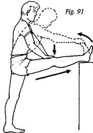 Stretching. Puneti calcaiul pe o masa sau pe un alt obiect situat la inaltimea coapsei (fig. 91). Apasati coapsa, chiar
