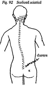 Daca sciatica devine cronica, organismul incearca in mod inconstient sa evite durerea si muta toata greutatea pe partea sanatoasa, ceea ce duce la o stare cunoscuta sub numele de scolioza sciatica (fig. 92). Pentru a o preveni, efectuati la vreme exercitiile de shiatsu si stretching, pentru a face mai flexibile picioarele si regiunea lombara: totodata, evitati frigul si umiditatea.