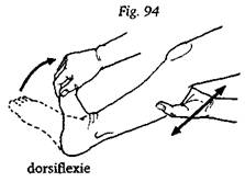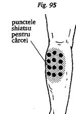 Shiatsu. Atunci cand apar contractiile, stati linistit, tinand piciorul intins in fata. Prindeti gamba intre degetul mare si celelalte patru degete ale mainii, apucati degetele piciorului cu cealalta mana si trageti-le spre dumneavoastra in dorsiflexie treptata (fig. 94). In acelasi timp, apasati gamba cu degetul mare si cu