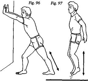 Stretching. Mai intai, stati cu fata la un perete, puneti pe el ambele palme, pentru sprijin, apoi duceti un picior inainte, iar pe celalalt spre spate (fig. 96). Impingeti trunchiul inainte, indoind genunchiul piciorului din fata, avand grija ca talpa piciorului din spate sa ramana pe podea. Ramaneti asa zece secunde. Reveniti in pozitia initiala, dupa care executati exercitiul cu celalalt picior. Repetati de trei ori, alternand piciorul drept cu cel stang.
